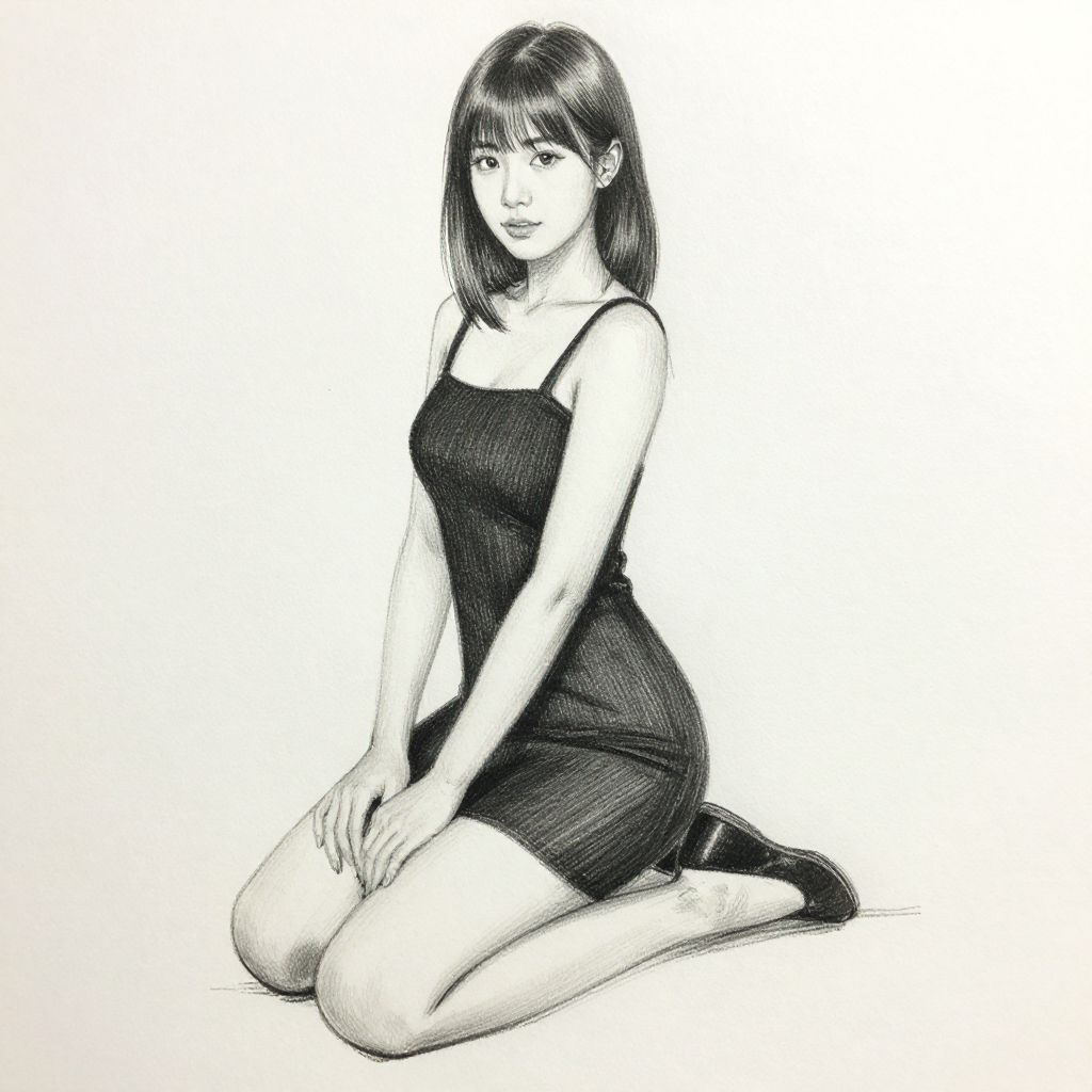 Almond Draw a full body an attractive young woman kneeling on the ground, black hair, short black summer dress, medium length hair, white background, sketch, pencil, draft,