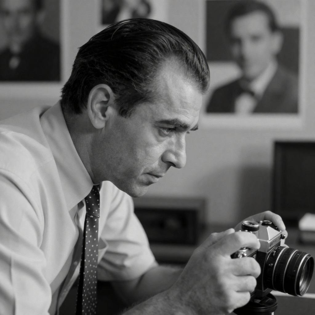Sepia-toned photograph of an older man with a stern expression, wearing a dark hat, suit, and tie, sitting at a wooden table. He holds a camera in his right hand and a rifle rests on the table in front of him. Wooden walls and a door are in the background. Light from a window on the right side casts shadows.