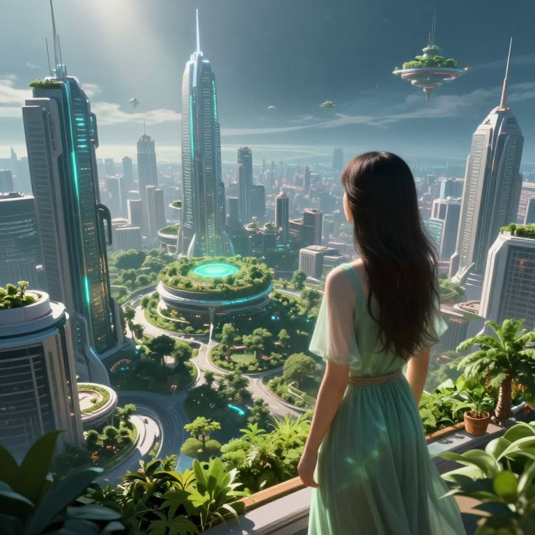This is a digital illustration depicting a futuristic cityscape from a high vantage point. A young woman with long, dark brown hair, wearing a light green, off-shoulder dress, stands with her back to the viewer, gazing at the city. The city features towering skyscrapers with green roofs, surrounded by lush greenery and circular parks. Hovering above the city are futuristic floating islands. The sky is bright with sunlight streaming through, creating lens flares. The overall color palette includes greens, blues, and metallic shades, giving a vibrant, utopian feel. The detailed, CGI style emphasizes a blend of nature and advanced technology.