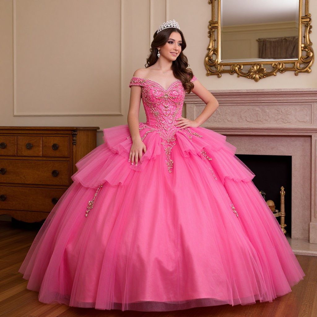 Photograph of a young woman with long, wavy dark brown hair, wearing a sparkling pink ball gown with an off-the-shoulder neckline, adorned with intricate silver beadwork. She also wears a silver tiara. The voluminous skirt features multiple layers of pink tulle. She stands in an elegant room with beige walls, a wooden dresser on the left, and a white marble fireplace with a gold-framed mirror above it. The wooden floor and subtle lighting enhance the regal atmosphere. Her confident stance and slight smile exude elegance and grace.
