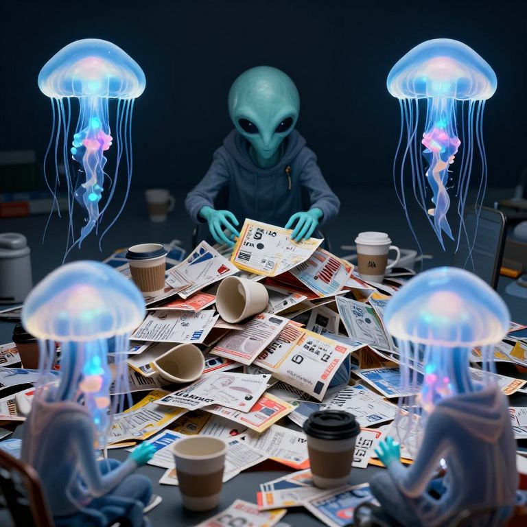 Alien archaeologists, shaped like bioluminescent jellyfish, attempt to reconstruct humanity’s existence from its junk mail and coffee cups.