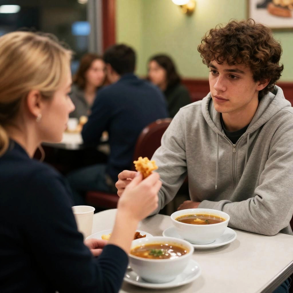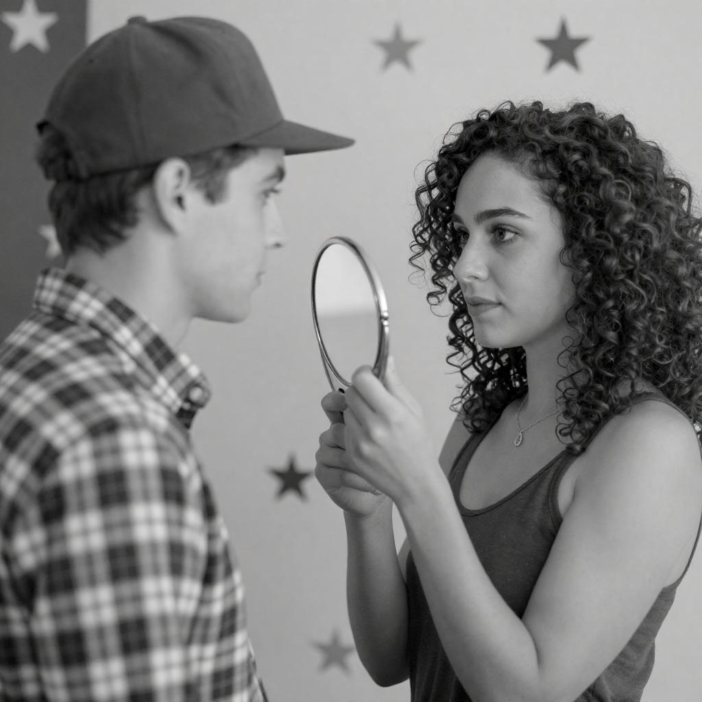 Photograph of a young man with curly dark hair, wearing a light blue t-shirt, pointing with his right hand at another person's hand. He has a focused expression. Background: pink and white tiled bathroom, green plant, black patterned trim. Two people.