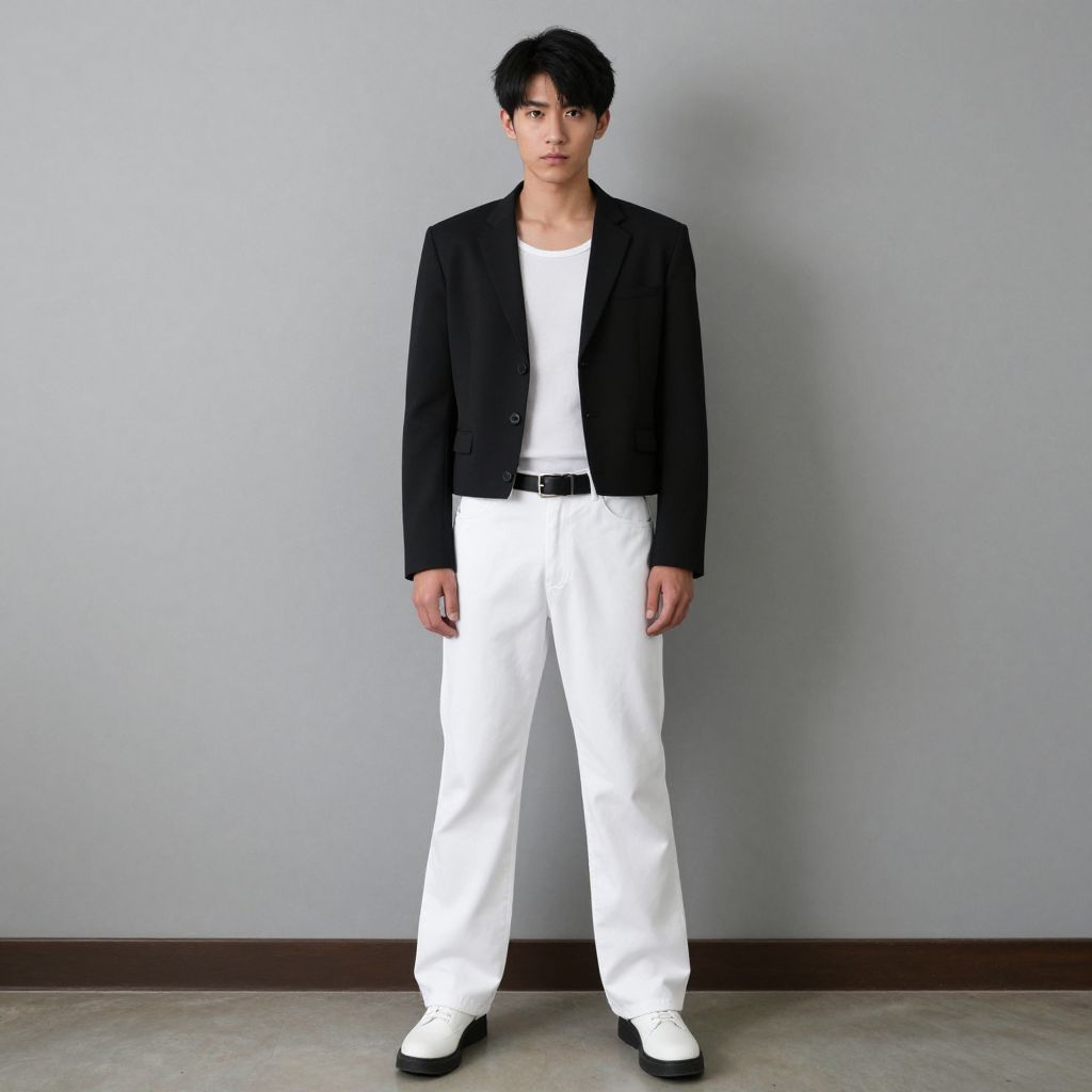 Full-body portrait of a young Asian man with black hair standing against a gray wall. He is wearing a cropped black jacket over a white T-shirt, white wide-leg pants with a black belt, and white shoes with black soles. The outfit has a modern, stylish look with a minimalist background.