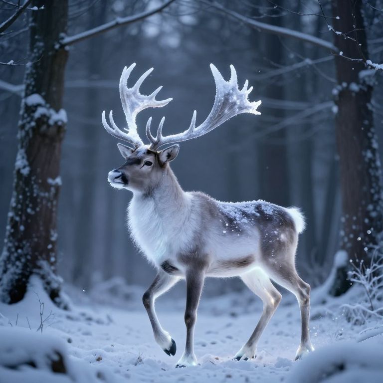 Photograph of a majestic reindeer standing in a snowy forest at night. The reindeer, with large, glowing, white antlers, has a light brown and white fur coat, illuminated by a soft blue light. Snowflakes gently fall around it, and the forest background is dark with tall, snow-covered trees. The reindeer's hooves leave small, illuminated prints in the snow as it walks. The overall scene is serene and magical, with a cool blue and white color palette emphasizing the winter setting.