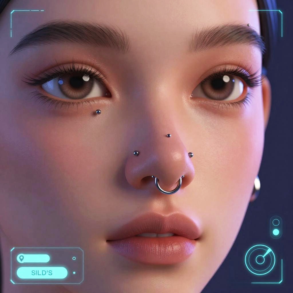 Nose piercing simulator showcasing a realistic 3D model of a human face with various nose piercing options like studs, hoops, and septum rings, vibrant lighting highlighting metallic textures, futuristic UI overlay, sleek modern design.
