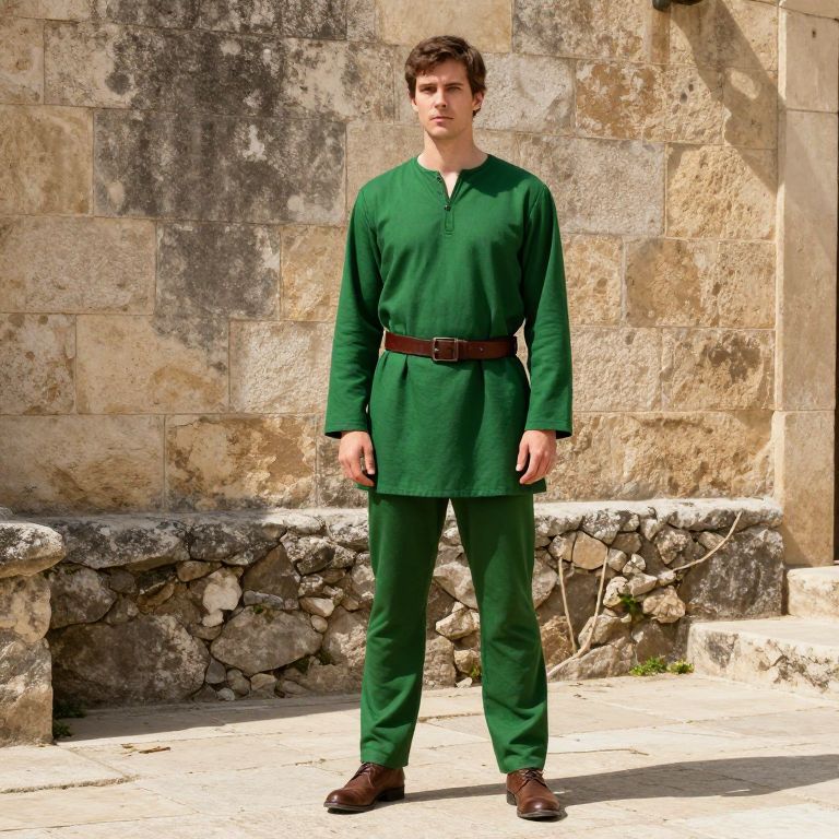 A tall, lean male with short brown hair and a neutral facial expression stands in front of a weathered stone wall. He wears a vibrant green outfit consisting of a green tunic and green pants, paired with a brown leather belt and brown leather shoes. The setting is a quiet, sunlit outdoor courtyard with soft shadows and subtle textures on the stone wall, adding depth and realism to the scene. The atmosphere is calm and grounded, emphasizing the contrast between the natural environment and the man's focused presence.