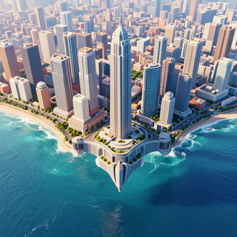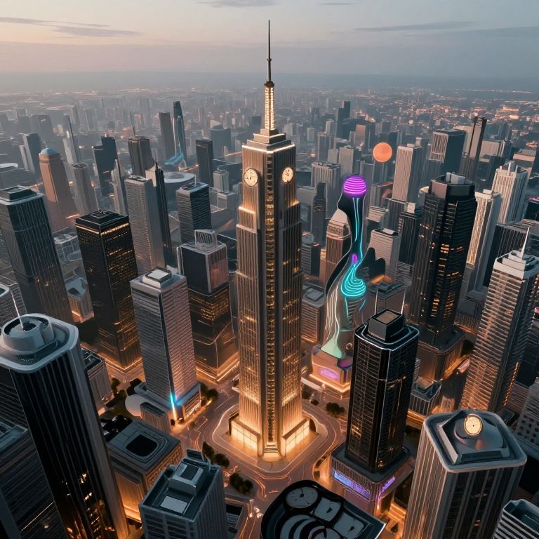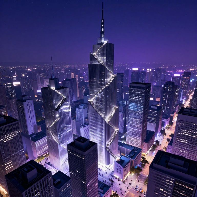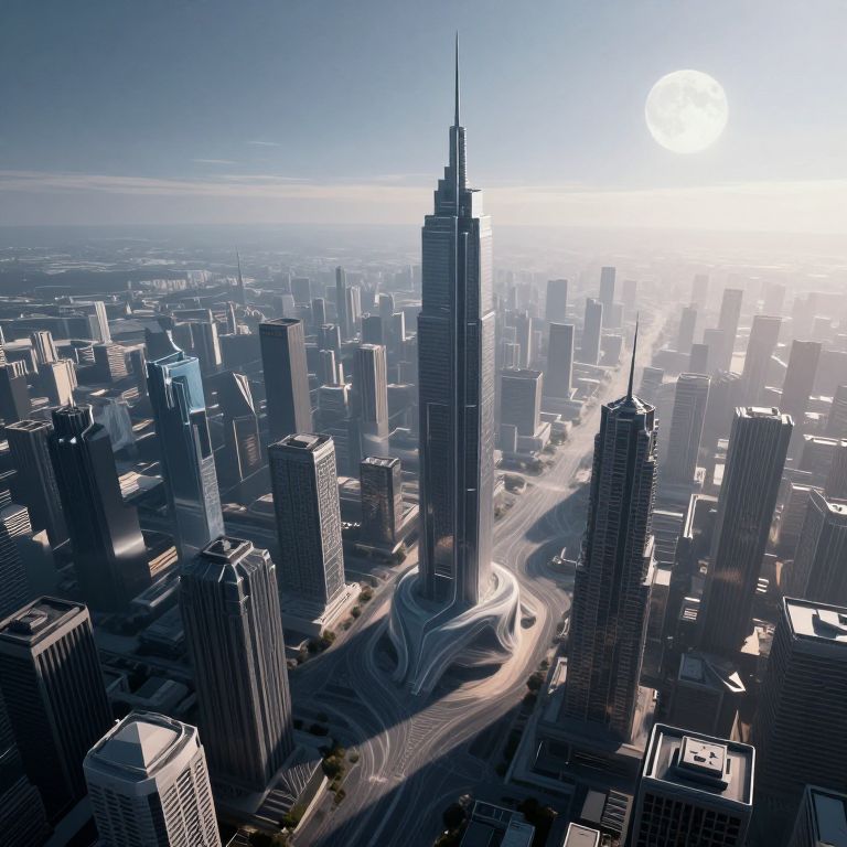 Photorealistic CGI of a futuristic cityscape with a towering, sleek, blue-lit skyscraper at its center, surrounded by densely packed, modern