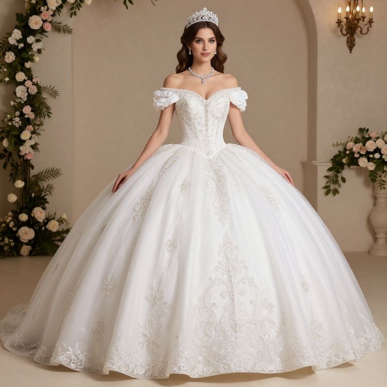 Elegant ball gown displayed on a mannequin, featuring a champagne-colored bodice adorned with intricate gold embroidery, puffed sleeves, and a voluminous skirt with layered ruffles and lace detailing, set against a deep blue curtain backdrop.