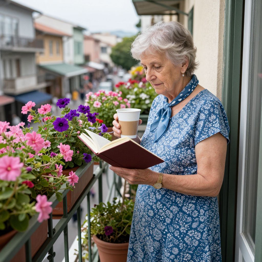 In this captivating image, an elderly woman stands on a balcony, engrossed in reading her diary. She is dressed in a blue floral dress, adorned with a scarf around her neck, and her hands are gently holding the book and a cup of coffee. The balcony railing, painted in a muted green, frames her figure, adding a sense of depth to the scene. To her left, a vibrant flowerpot brimming with pink and purple flowers adds a touch of nature and color to the setting. The background reveals a bustling street scene, with people and buildings visible through the window, creating a stark contrast between the serene balcony and the lively urban environment. The overall composition is harmonious, with the woman, her diary, and the coffee cup forming a central focal point, while the flowers and the street scene provide a rich tapestry of detail and context.