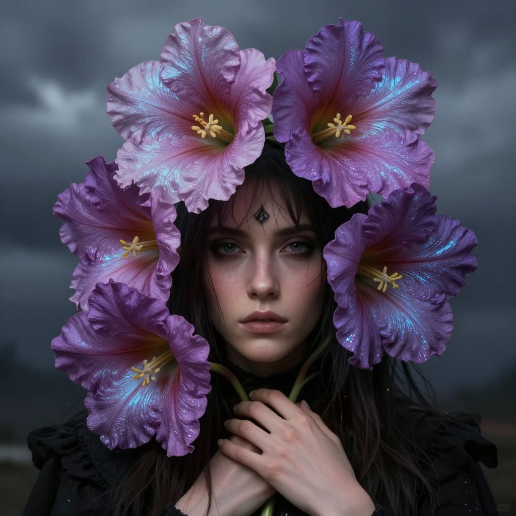 This photograph features a pale-skinned woman with striking, intense blue eyes and dark, straight hair, adorned with large, luminescent purple flowers with glowing blue and yellow centers. The flowers frame her face, and her hands are delicately clasping the stems near her neck. She has a small, dark teardrop-shaped mark on her forehead. Her expression is serious and focused. The background is a moody, dark, overcast sky, adding a dramatic contrast to the vibrant flowers and her pale complexion. The overall style is ethereal and surreal, with a focus on the mystical beauty of the subject.