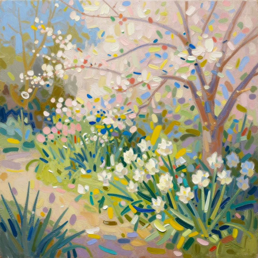 Vibrant impressionist painting of a spring garden with blooming white flowers, colorful foliage, and a sunlit tree in the background.