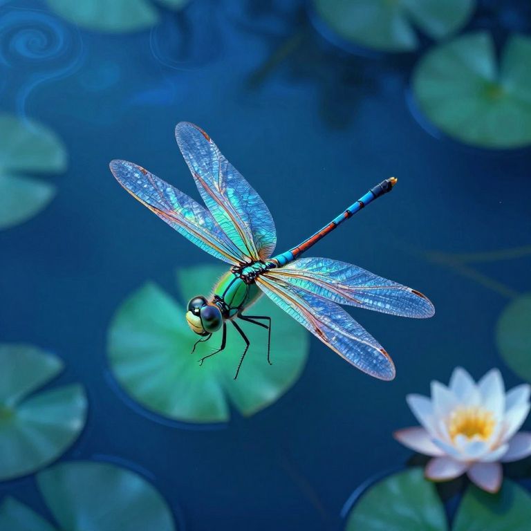 Create an intricate digital art portrait of an enigmatic dragonfly, capturing its ethereal essence with vivid blues and greens reminiscent of swirling night skies. Observe the delicate intricacies of its iridescent wings and slender body from a captivating aerial viewpoint above tranquil waters, where it gracefully hovers among dreamy water lilies. The mesmerizing scene evokes a sense of wonder and serenity, inviting viewers into the enchanting realm of these elusive creatures with an emotional gradient that transcends reality.