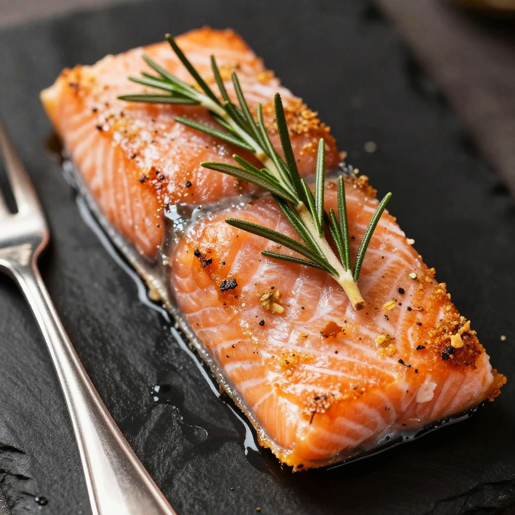 Photograph of a close-up, golden-brown, herb-crusted salmon fillet with visible rosemary sprigs on top. The fish is positioned on a glossy black surface, with a shiny, silver fork partially underneath it on the left. The texture of the salmon looks flaky and slightly crispy, with a vibrant orange hue. The background is blurred, focusing attention on the fish.