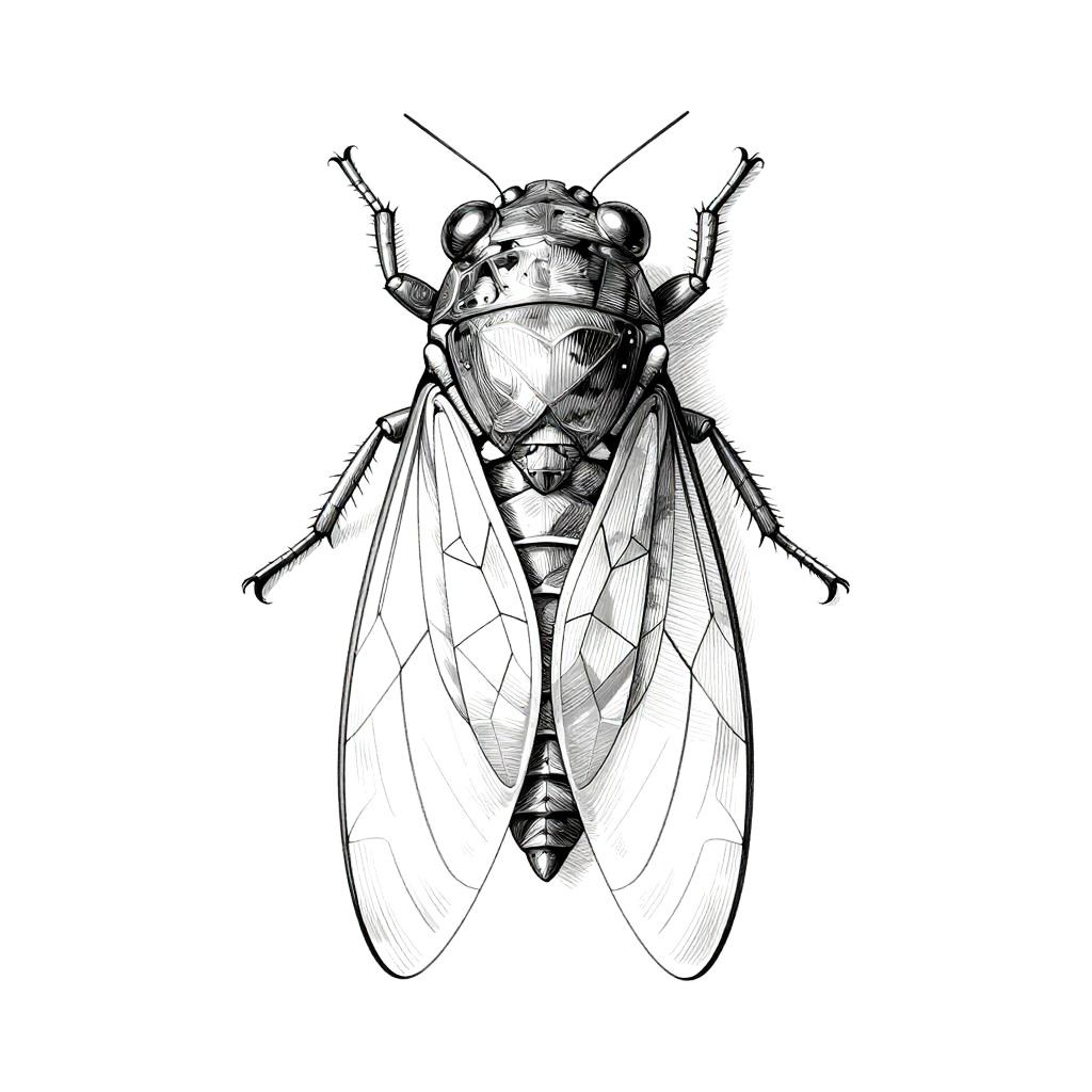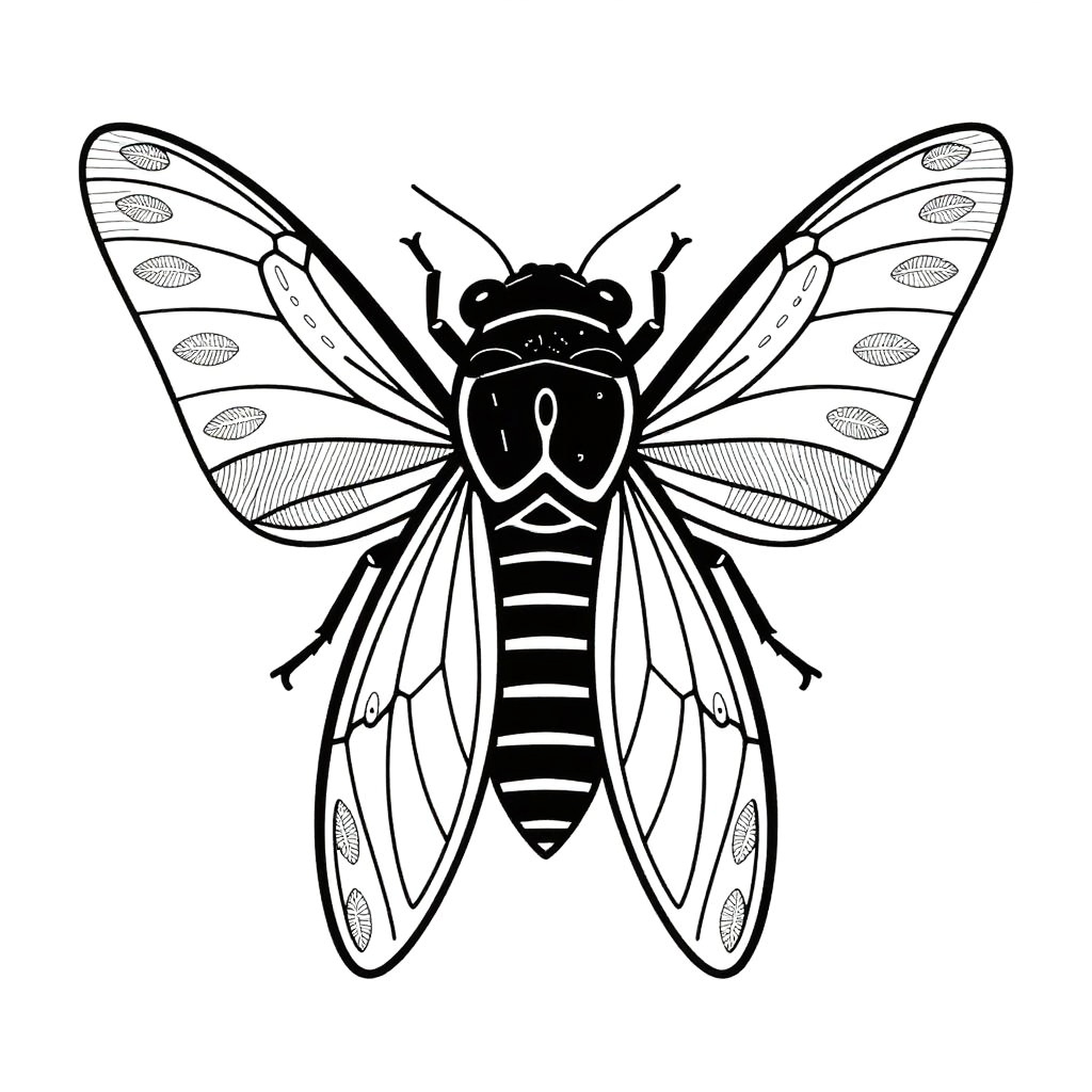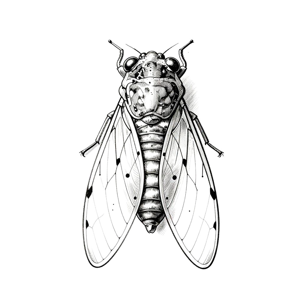Detailed cicada line art showcasing transparent wings with delicate veins, ornate body structure depicted with fine strokes, minimalist monochrome style, suitable for tattoo design or natural history illustration, set against a plain background with high contrast.