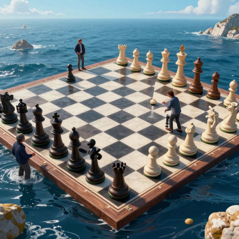 A digital illustration depicts an oversized chessboard floating on a deep blue ocean. Two men, one in a dark suit and the other in a white shirt and gray pants, stand on opposite corners of the board. The chess pieces, in black and white, are large and detailed, with some pieces partially submerged in the water. The background features a bright blue sky with fluffy clouds and distant rocky cliffs. The chessboard has a wooden border, and the ocean's waves gently lap against it. The image has a surreal, fantastical quality.