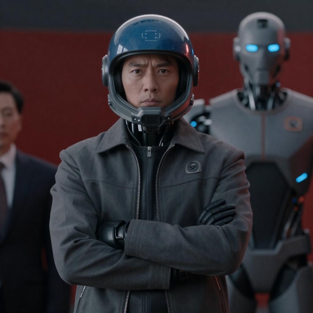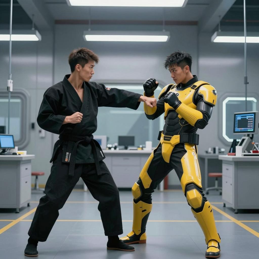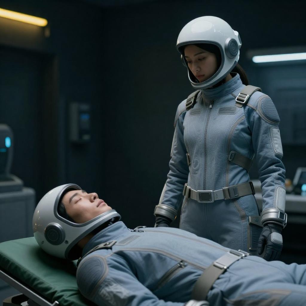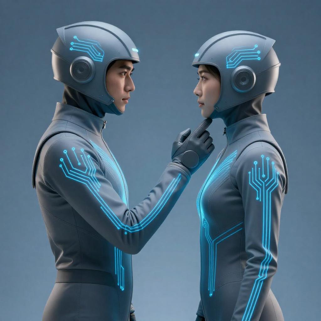 Photograph of two people with glowing blue circuit-like patterns on their gray bodysuits and helmets. They face each other; the person on the left touches the other's cheek. Background is a gradient of blue. Both have focused expressions.