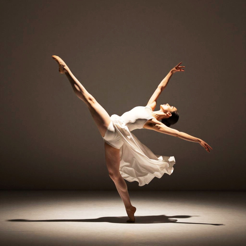 A dancer with elongated limbs performing an elegant pose on a minimalist stage, soft shadows and warm spotlight, modern art style with fluid motion and delicate textures