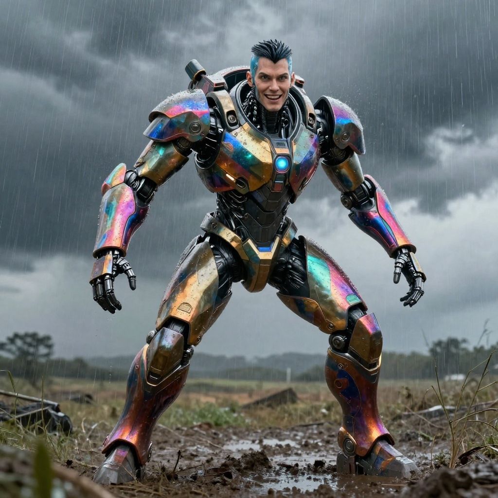 Photograph of a muscular man with short black hair, wearing a highly detailed, metallic, superhero-style armor with iridescent gold, blue, and purple hues. The armor has a futuristic design with a glowing blue chest emblem. He stands in a wide, powerful stance on a muddy, rain-soaked field with dark, stormy clouds in the background. His expression is determined and intense. The armor's texture is sleek and reflective, contrasting with the rough, grassy terrain and puddles beneath him. The overall mood is dramatic and action-oriented.
