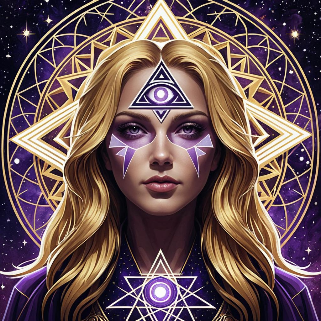 Digital portrait of a golden-haired goddess with a glowing purple third eye chakra and intricate geometric face markings. She is set against a detailed sacred geometry mandala background with a starry cosmic theme, combining sci-fi and spiritual art elements in a smooth, sharp-focused style.