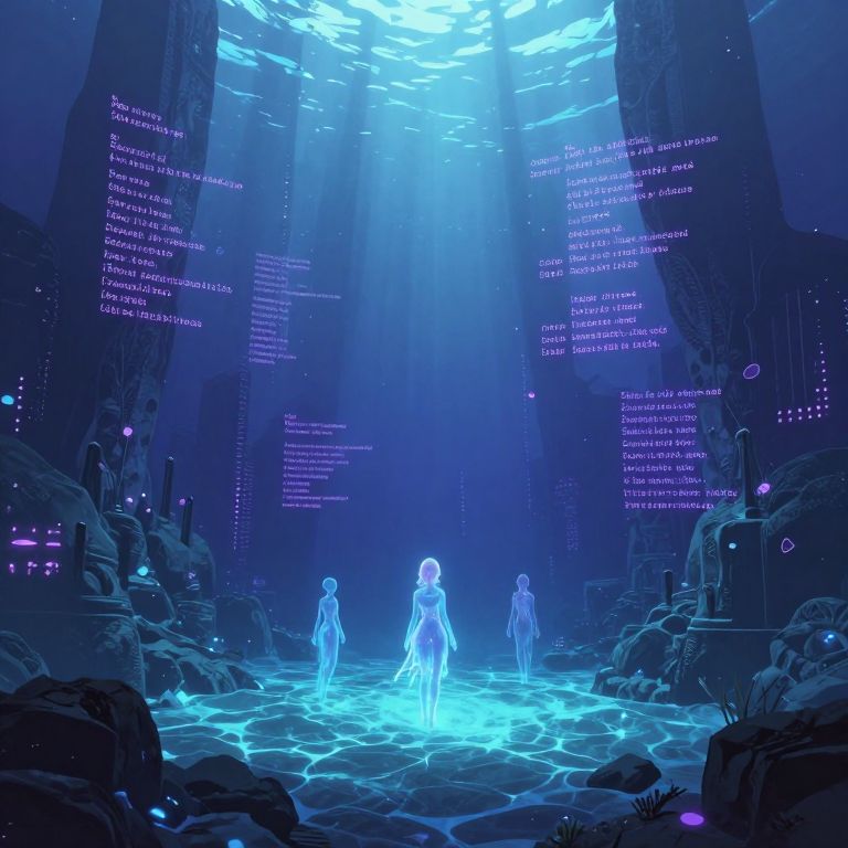 Digital artwork depicts a sci-fi underwater scene in vibrant blue hues. Three glowing, ethereal, humanoid figures stand in a luminous, hexagonal pool at the center. The figures have translucent, bioluminescent bodies, emitting a soft blue light. Surrounding the pool, rocky formations and futuristic, dimly lit structures are visible. Neon-like text in purple floats in the background, adding a cybernetic feel. Light beams from above illuminate the scene, creating a mystical atmosphere. The overall style is futuristic and otherworldly, with a focus on glowing elements and digital aesthetics.