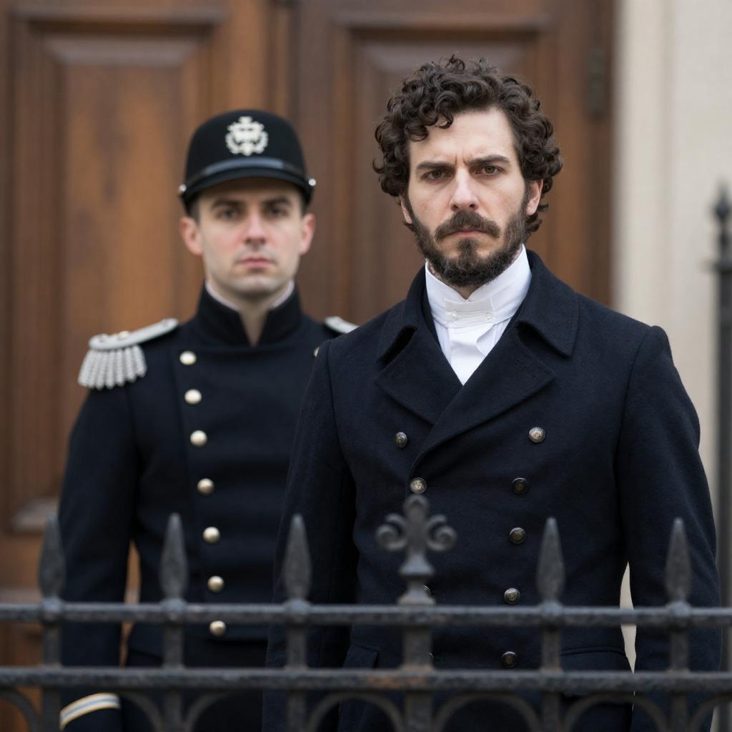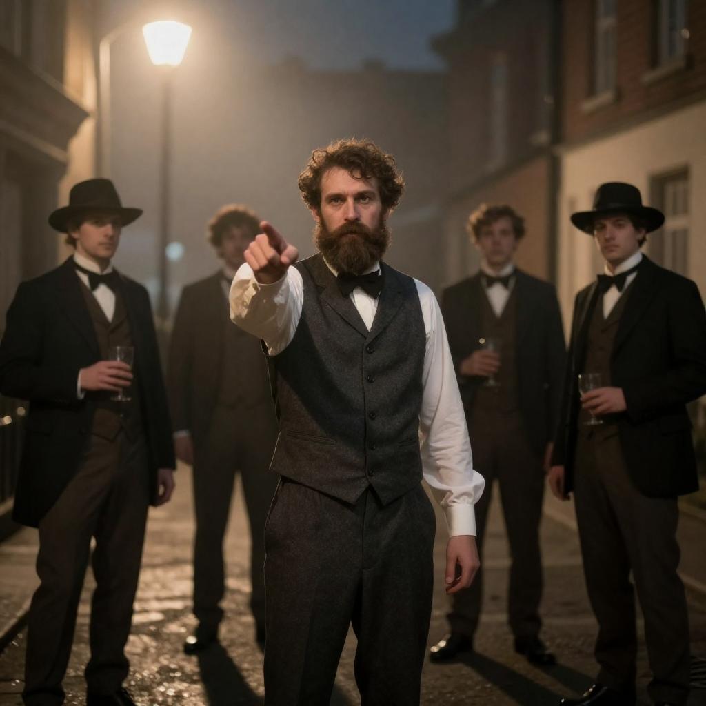 Photograph of six people in Victorian-era clothing standing in a dimly lit, ornate room. Central bearded man with crossed arms wears white shirt and gray vest. Surrounding him are five others in dark suits and coats, with one woman in a long, dark dress. Background features intricate gold decorations.