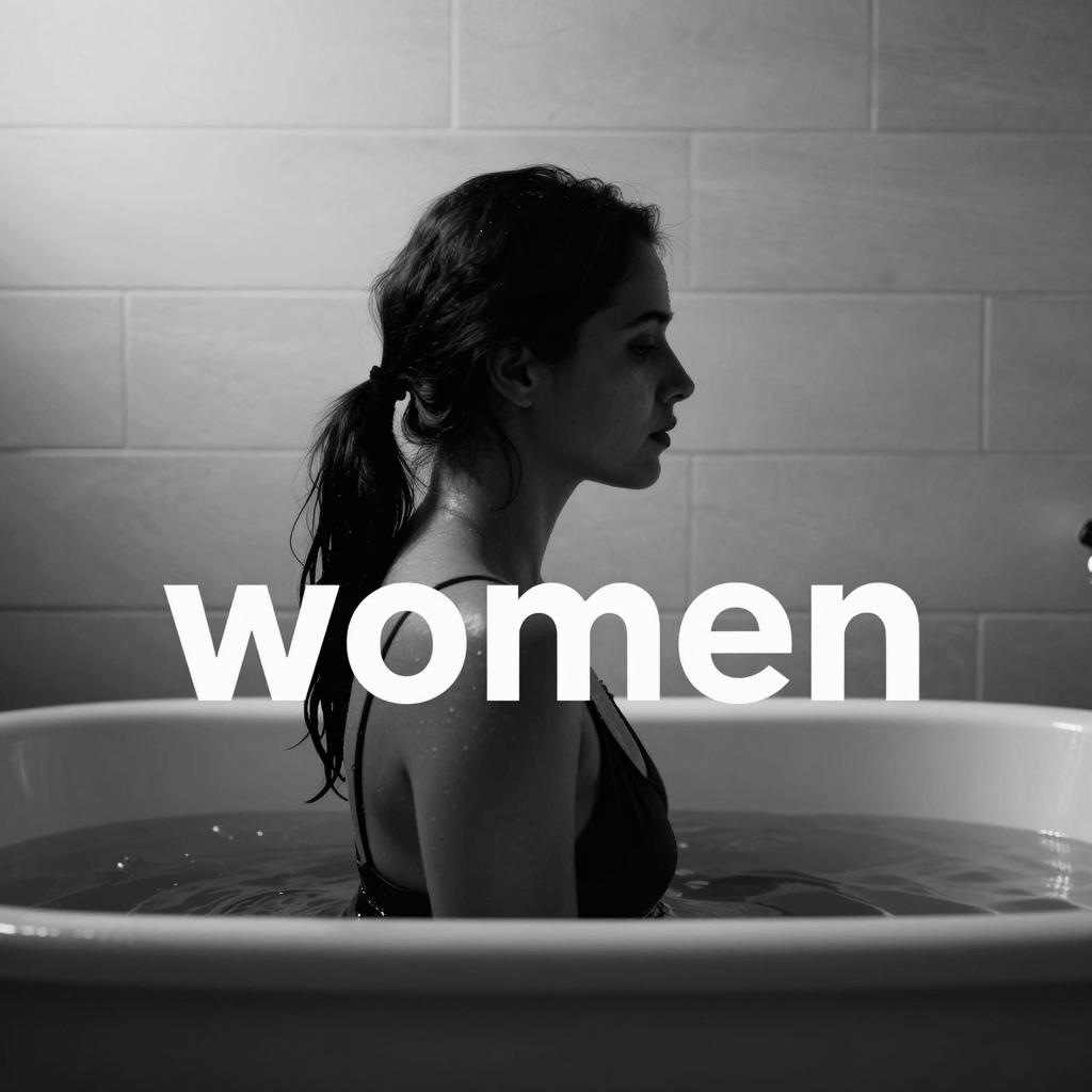 Black-and-white photograph of a woman with dark hair in a ponytail, facing right, sitting in a wooden bathtub. Silhouette against light wood walls. Text "women" overlays the image in the center. Woman wears a dark top. High-contrast lighting. Woman's profile in shadow, no facial expression visible. Upper body and head above water.