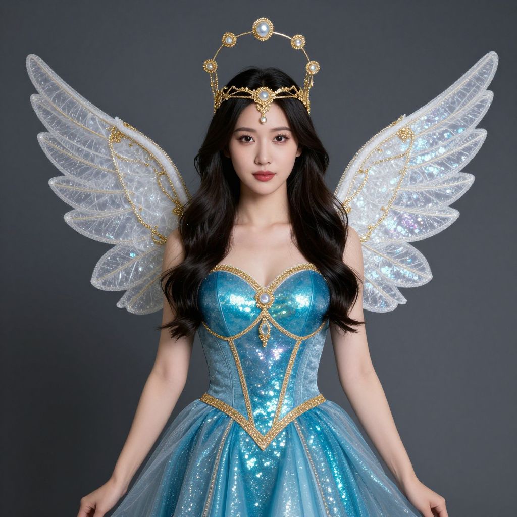 Glitter Goddess Costume, a woman in a blue dress with a gold headpiece and wings