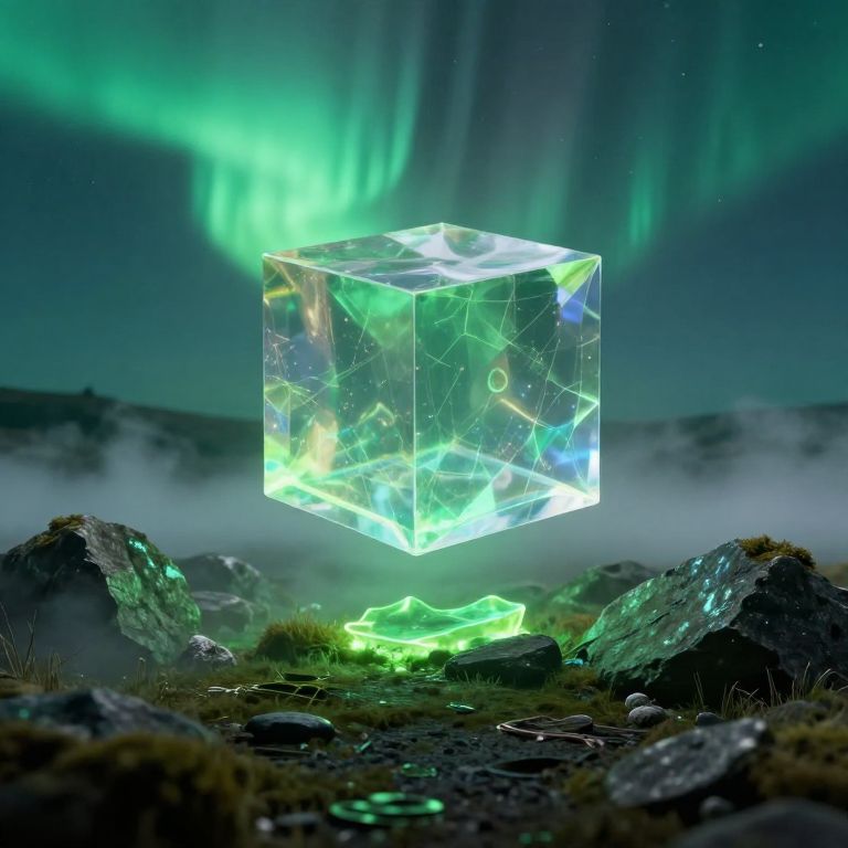 "Ron Weasley Landscape with a transparent cube levitating in the middle of a scene, Editorial Style Photo, Eye Level, aurora borealis, luminous rocks, fog, magistral, green sky, Natural Light, 4K,"