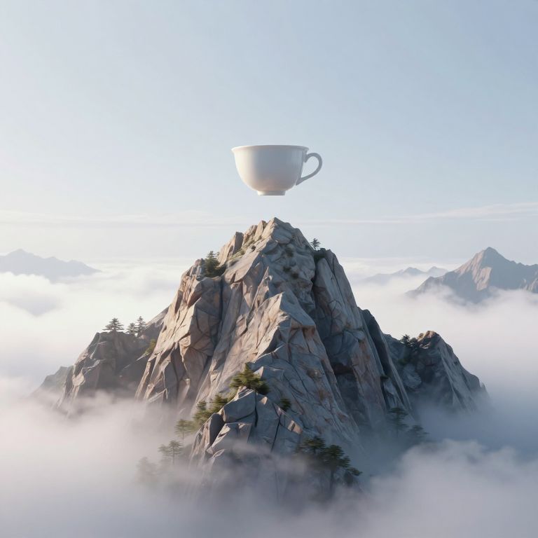 A surreal 3D-rendered scene depicts a serene mountain peak shrouded in mist, crowned by a solitary floating teacup, evoking a dreamlike, ethereal atmosphere with its high-definition clarity and dramatic lighting.