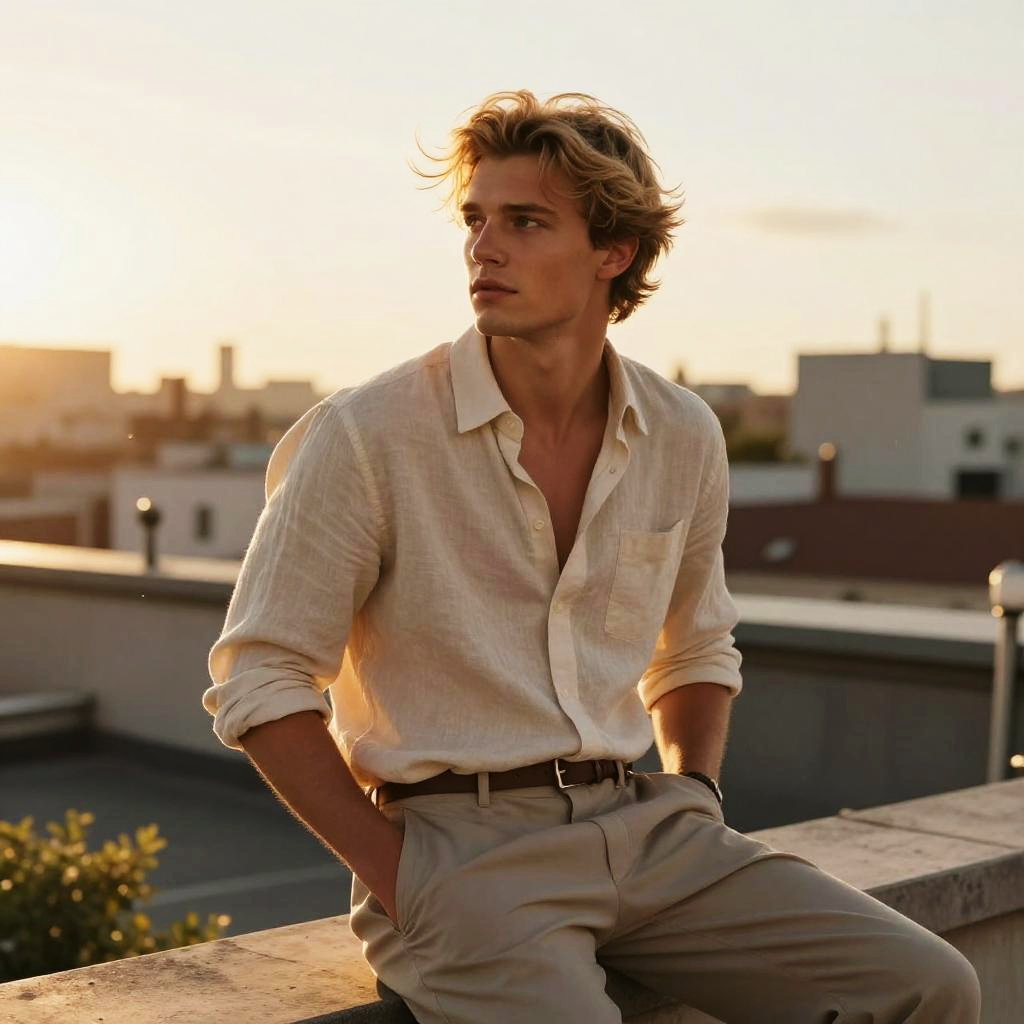 (masterpiece:1.1), best quality, (photorealistic:1.2), hyperrealistic, award-winning portrait of young man, early 30s, sandy blonde hair, thoughtful expression, upper body, expressive eyes, slim wai BREAK 1.1, wide hips:1.1, athletic-curvy build, wind-swept hair, sitting in urbane rooftop garden at sunset, wearing casual linen shirt and tailored trousers, golden hour glow, dappled light, soft particles in the air, 8k, highly detailed, broad lighting, chromatic aberration, subtle film grain, ray tracing, octane render, soft bloom