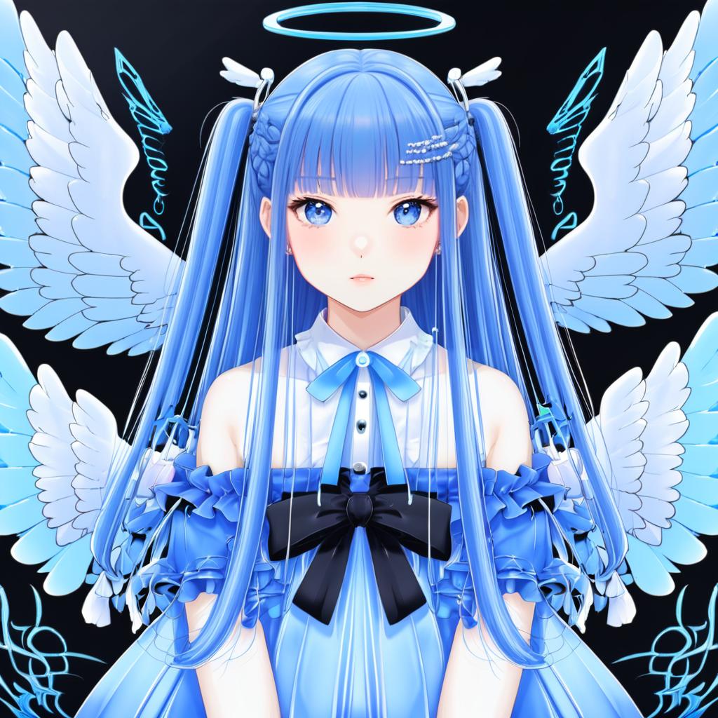 Digital artwork of an anime-style female virtual youtuber featuring long blue hair styled with two side ponytails and decorative hairclips. She has bright blue eyes, pale skin, and an ahoge strand on her head. She is dressed in an off-shoulder light blue dress with ruffled sleeves and a large black ribbon at the chest. Behind her are large detailed angel wings and a glowing halo above her head, set against a dark background with blue ornamental designs.