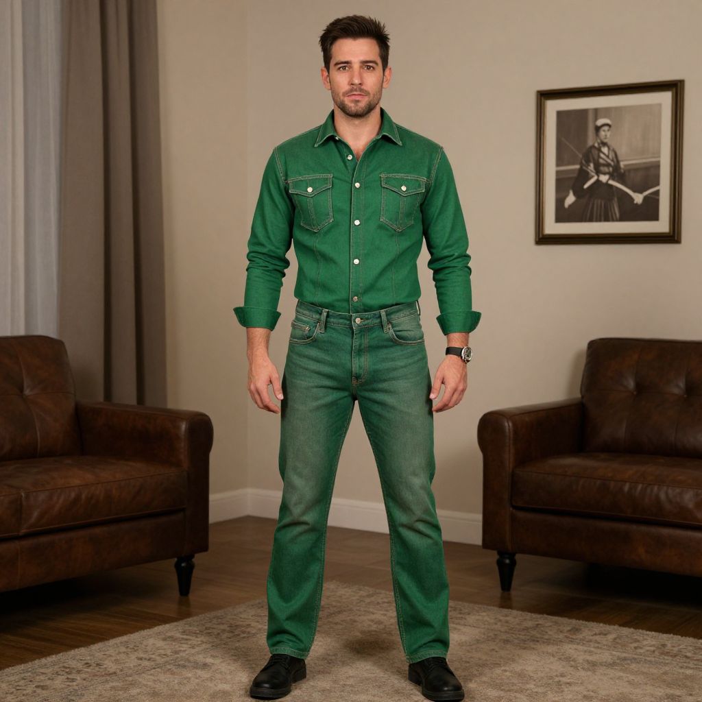 Green Jeans Man Costume, man in a green shirt and jeans standing in a room