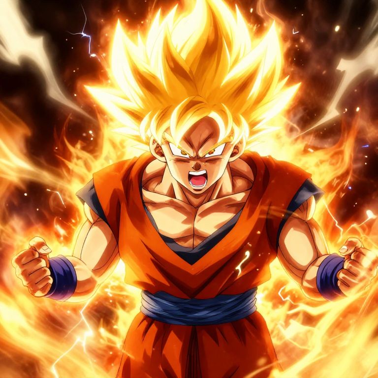 Digital anime artwork of Goku, a muscular male with spiky orange hair, fiery aura, and red-orange martial arts outfit, clenched fists, and