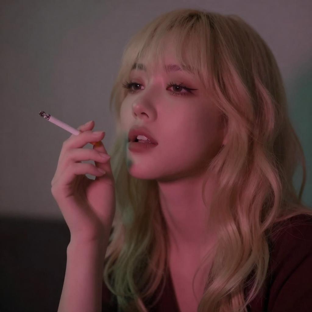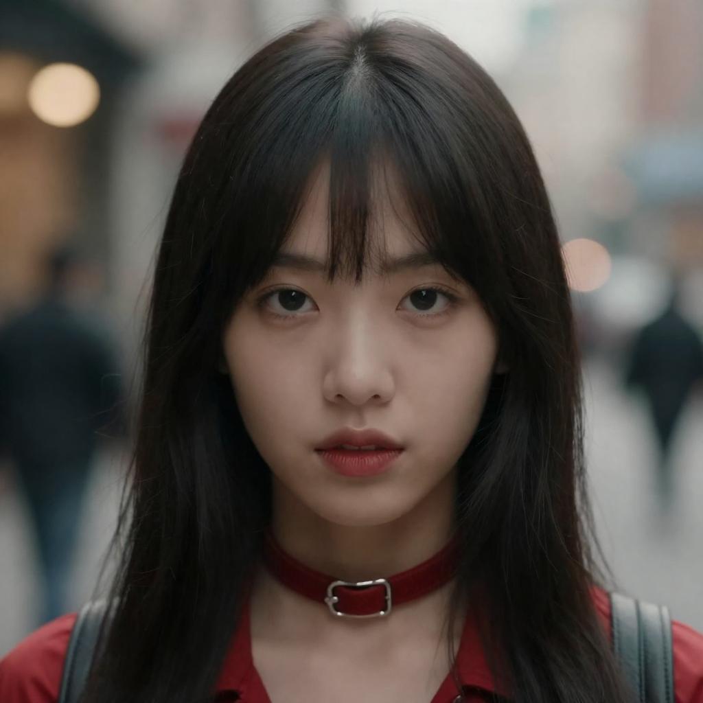 Close-up photograph of a young woman with fair skin and blonde hair in a slightly messy updo. She has red lipstick and a serious expression. She wears a brown leather jacket and a thin necklace. Blurred dark background.