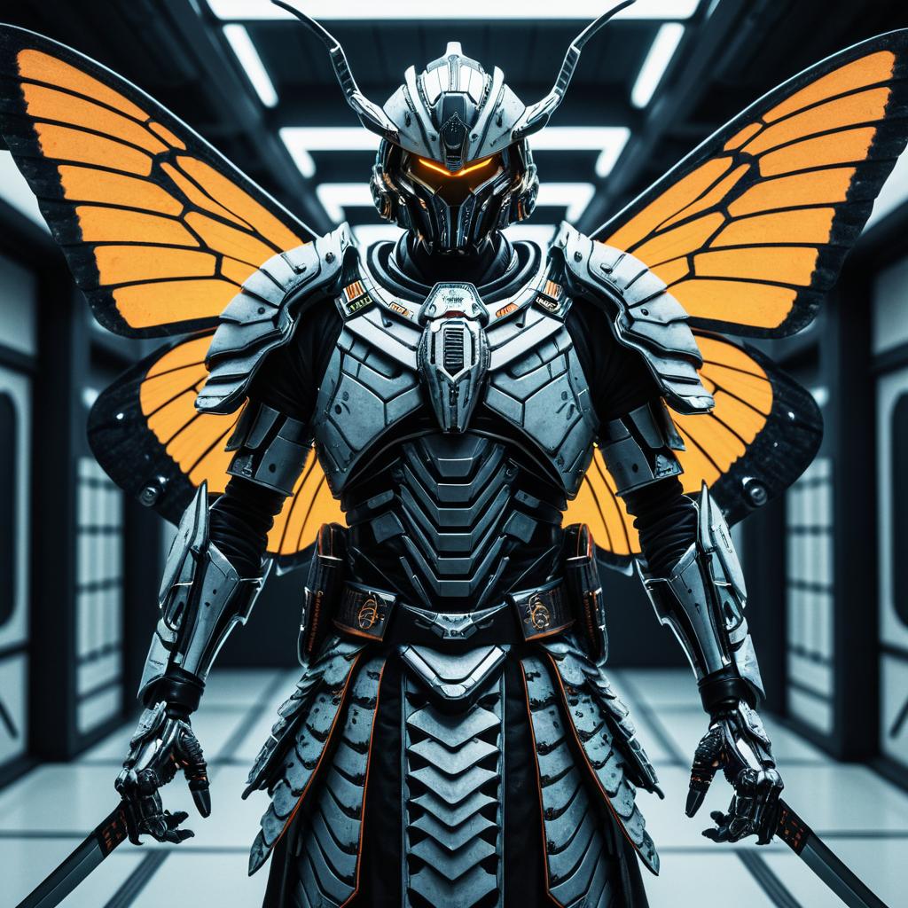 Full-length profile portrait of a female android in biomimicry style, skin resembling blue butterfly wings, biopunk alien design, T-pose, hyper-realistic details, wide angle, octane render, inspired by James Jean