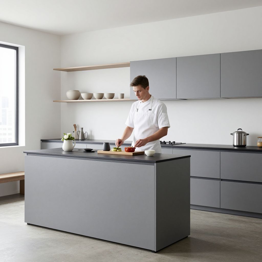 Photograph: Modern kitchen with gray cabinets, white walls, and a man in a white shirt slicing vegetables on a gray island. Bright natural light from