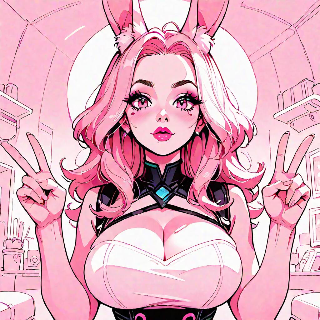 Score_9, score_8_up, score_7_up, Expressiveh, ultra detailed, twitch, one sexy girl shows her cleavage, rabbit girl, solo, cute, delicated and beautiful face, animal ears, huge breasts, thin waist, sleeveless shirt, v sgin, streaming, neon room, pink theme, (pov:0.9)