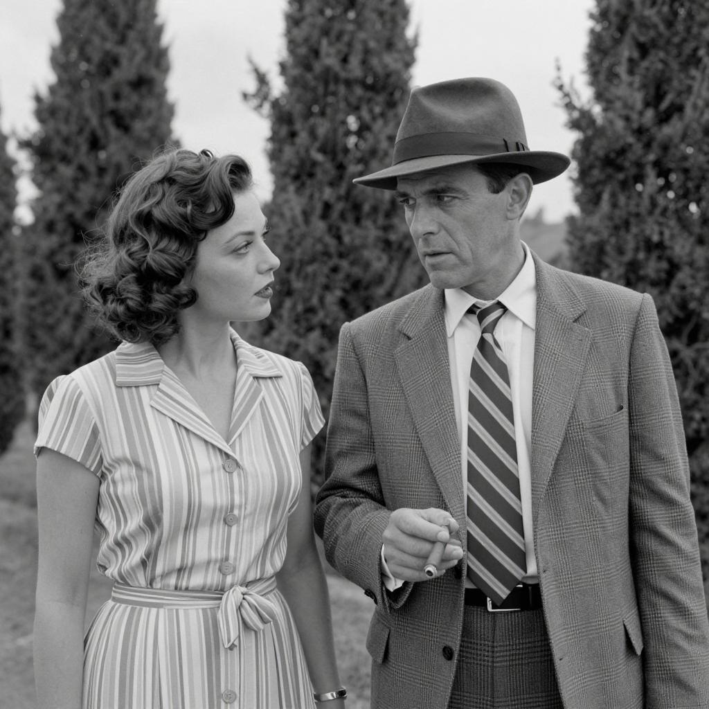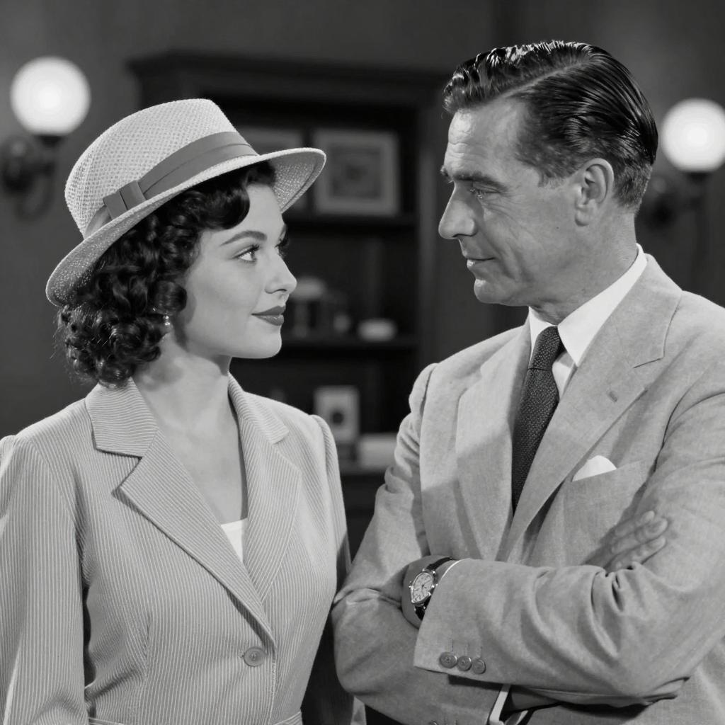 Black and white photograph of a man and woman in a studio. Man in light suit, dark tie, and fedora holds a vintage microphone, looking to the side. Woman in dark pinstripe suit, white collar, and dark hair with waves, smiles and holds a microphone, looking towards the camera. Both have intense expressions. Background includes a circular window and blurred studio equipment.