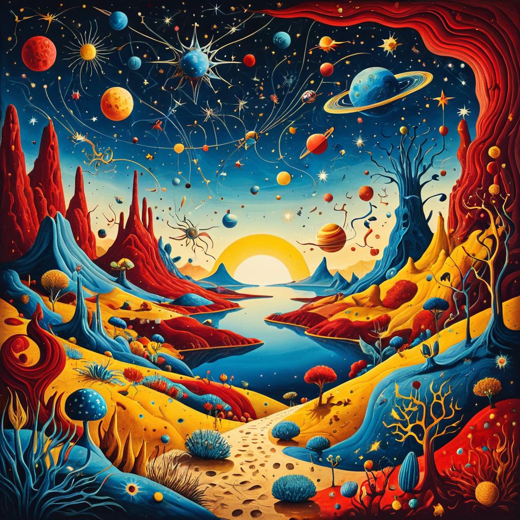 Artwork inspired by Salvador Dalí style, depicting fantastical landscape with surreal creatures, surrounded by organic colorful shapes and constellations, bright warm colors of red, yellow, and blue, infused with magic and dreamlike atmosphere