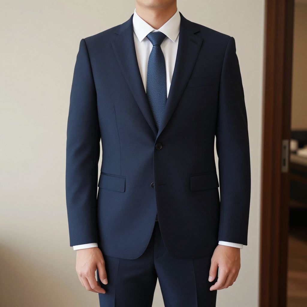 Photograph of a man from the neck to the waist, wearing a well-fitted, dark navy blue suit with a single-breasted jacket, white dress shirt, and a solid navy blue tie. The suit has a classic, sharp cut with two chest pockets and two flap pockets on the trousers. The man's hands are relaxed at his sides. The background is a plain, light-colored wall with a partially visible wooden doorframe on the right. The lighting is natural, highlighting the suit's smooth texture and formal appearance.