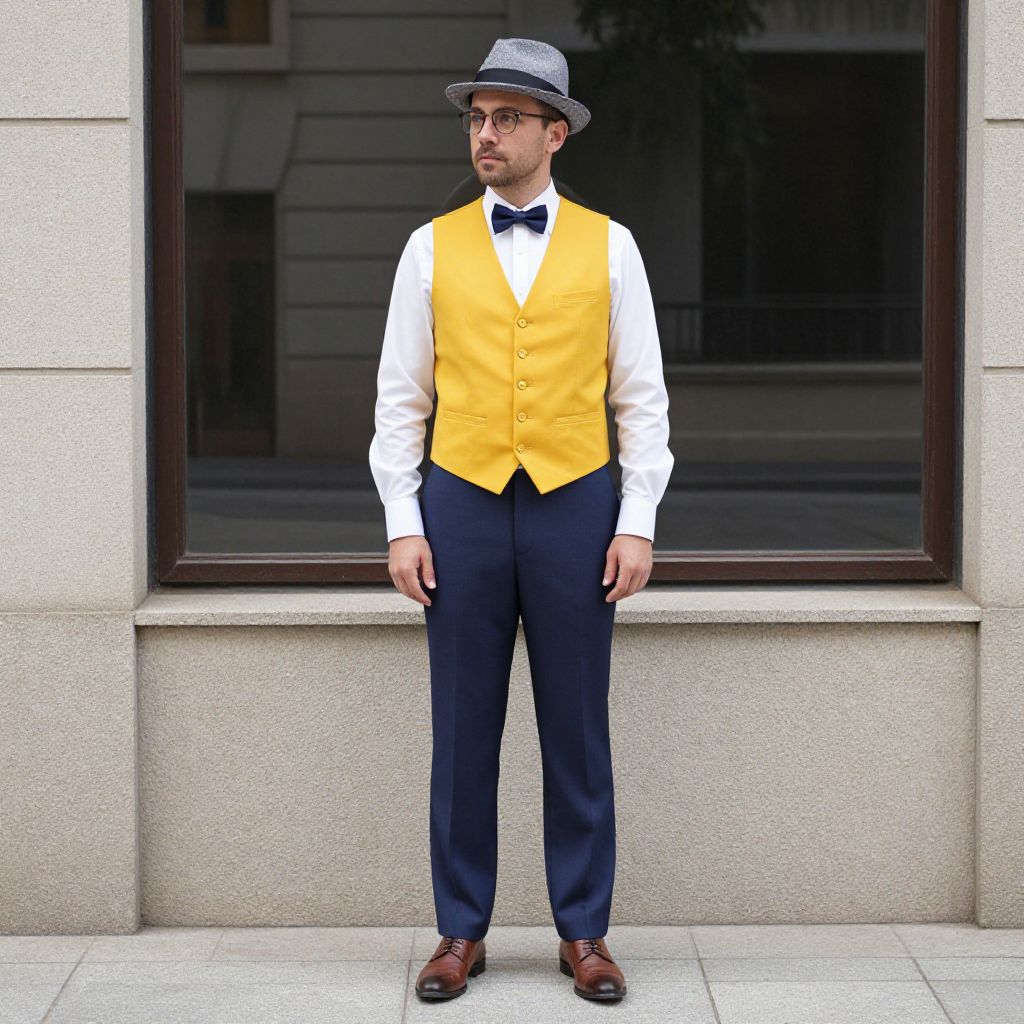 Man wearing a yellow vest, white shirt, and blue pants with a bow tie. He is also wearing a hat and brown shoes. The man is standing in front of a building with a large window.