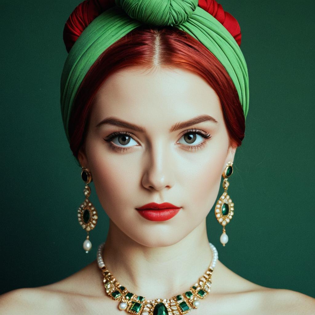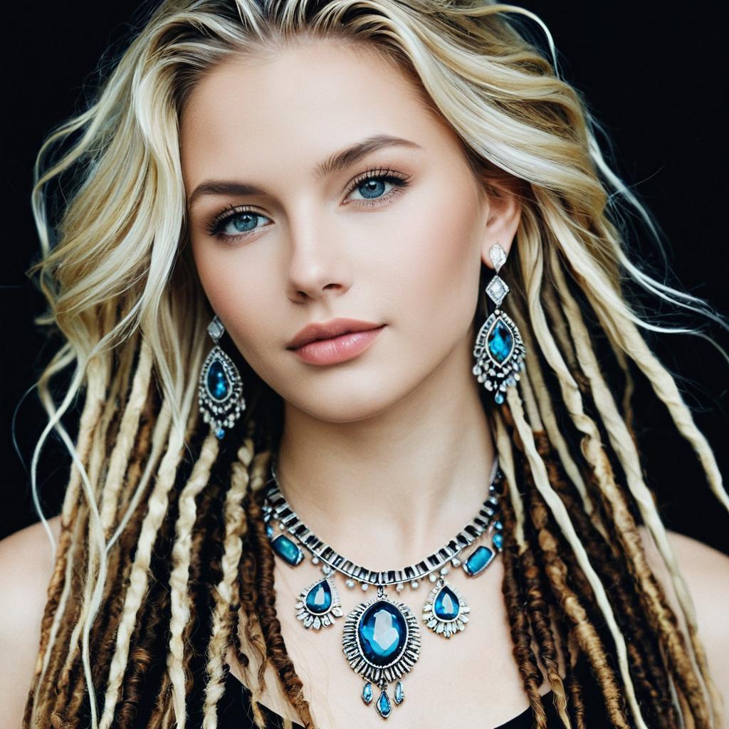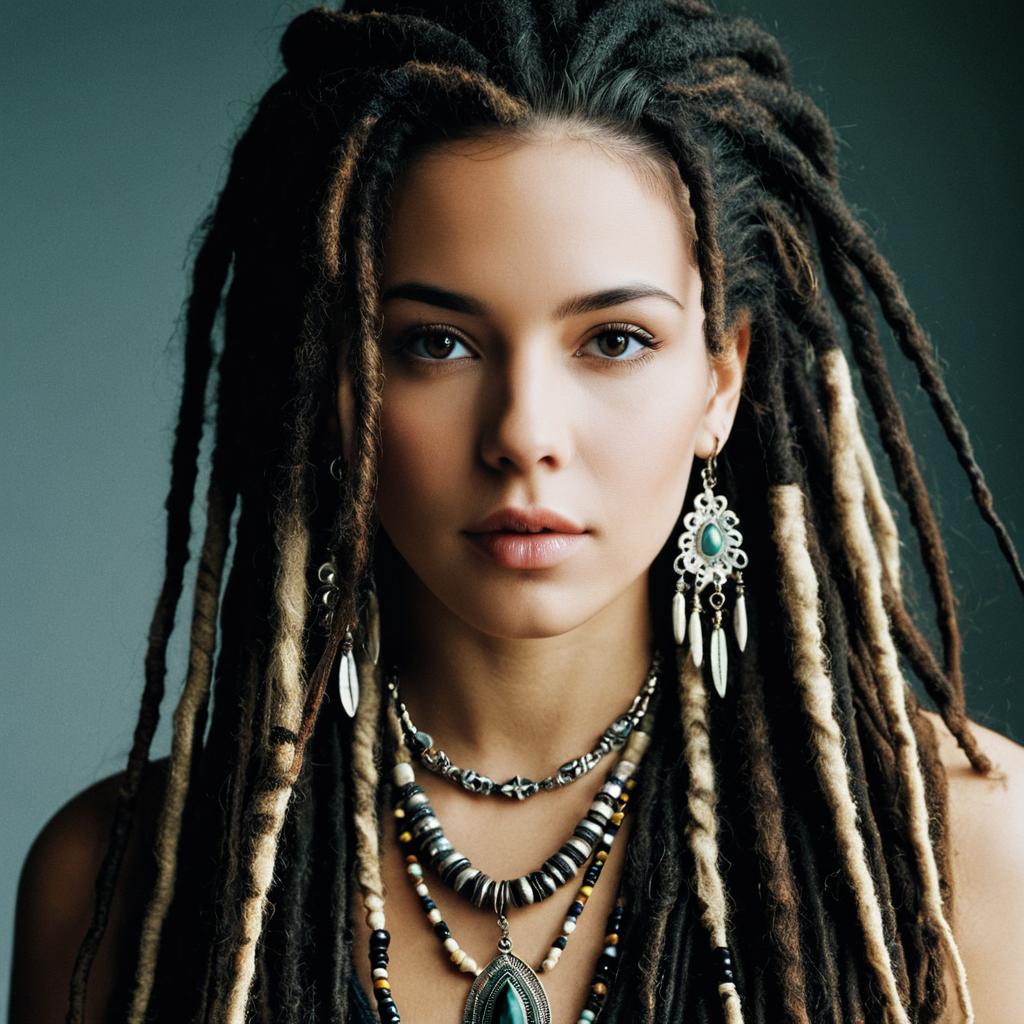 Close-up portrait of a young woman with bright red soft locs styled as long dreadlocks. She has brown eyes and natural makeup, wearing intricate silver earrings and multiple beaded necklaces in red, black, and white colors. The image focuses on her upper body against a plain background, highlighting her distinctive hair and elegant accessories.