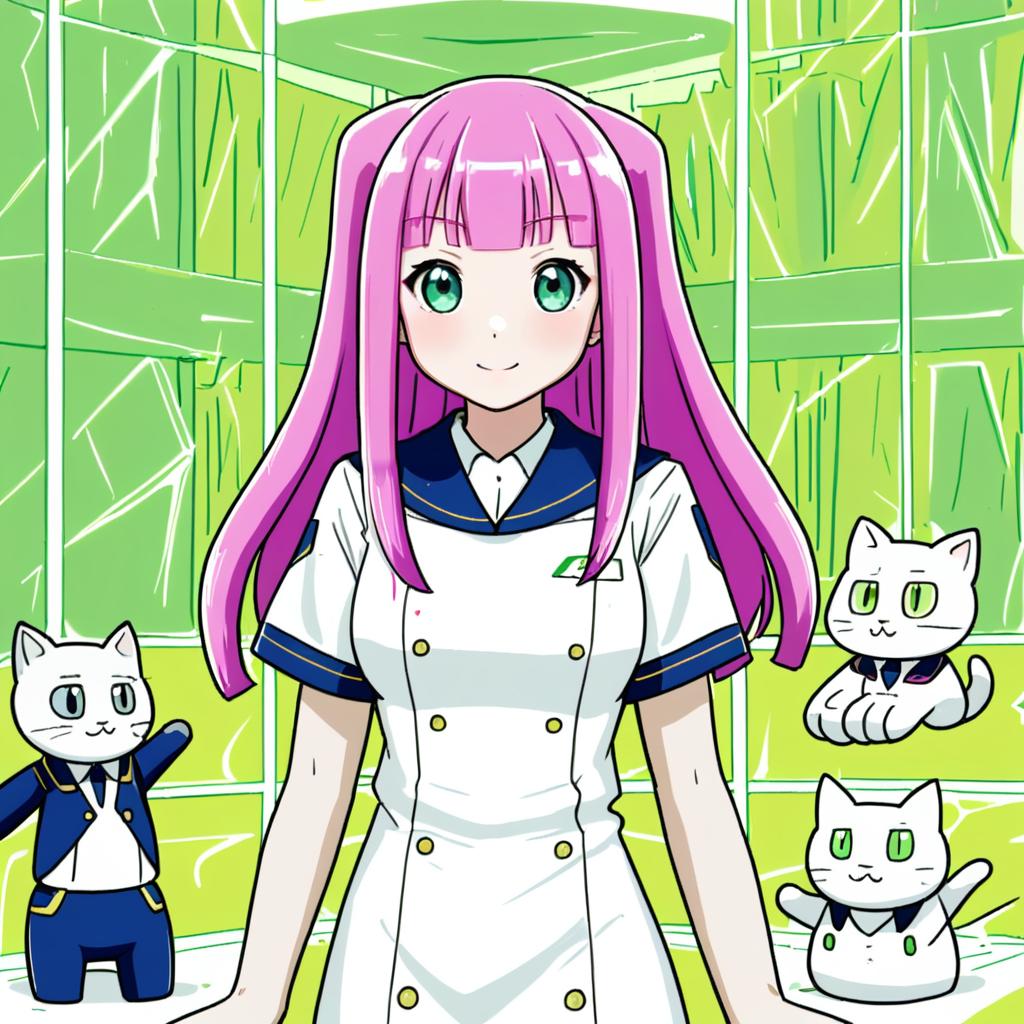 Aria pokoteng, aria (manga), 1girl, green eyes, short hair with long locks, pink hair, long hair, sidelocks, hair tubes, aria company uniform, uniform, aria company uniform, uniform, white dress, long dress, white shirt, clothing cutout, short sleeves, sailor collar, cat, blouse, side slit, by artist coro fae, leet