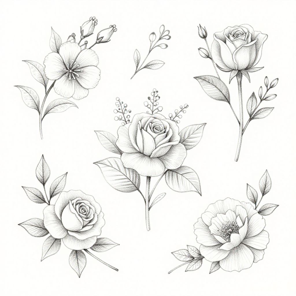 Drawing art pictures illustrating vintage floral designs with intricate patterns and fine line work, enhanced by subtle watercolor gradients and soft shadows, creating an elegant and timeless botanical art style full of delicate beauty.