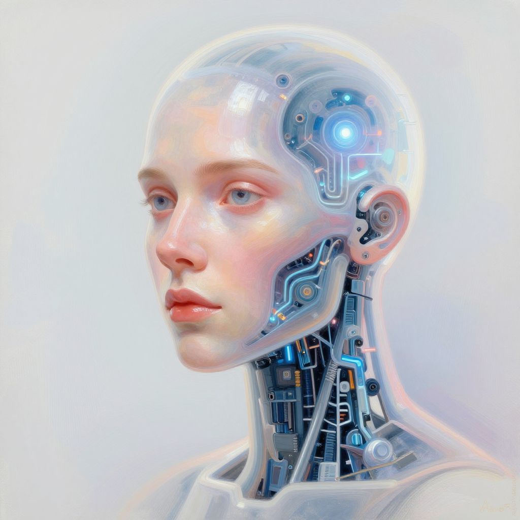 Ai image generator producing an abstract portrait of a humanoid robot with translucent skin revealing glowing circuits inside, soft pastel color palette with detailed brush strokes, combining human emotion and machine intelligence in digital painting