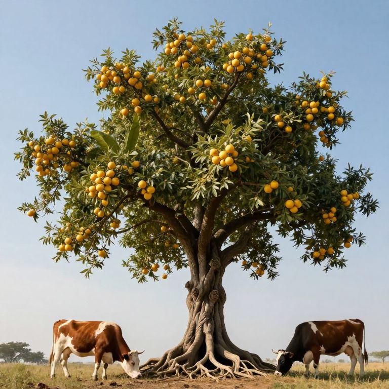 A majestic tree adorned with golden fruits defies gravity as its branches extend into the sky, while two celestial cows graze serenely beneath its roots, creating a surreal harmony between earth and heavens.