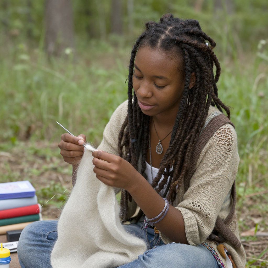 Photograph of a Black woman with long, dark, tightly coiled dreadlocks, sitting cross-legged in a forest. She is focused on knitting a white, textured fabric with thin, white yarn. She wears a beige, knit cardigan over a white shirt, and blue jeans. A silver necklace with a circular pendant rests on her chest. In the background, there are blurred green trees and grass, with a stack of colorful fabric or book covers on the ground to her left. The image has a natural, outdoor light setting, emphasizing the greenery and casual, peaceful atmosphere.