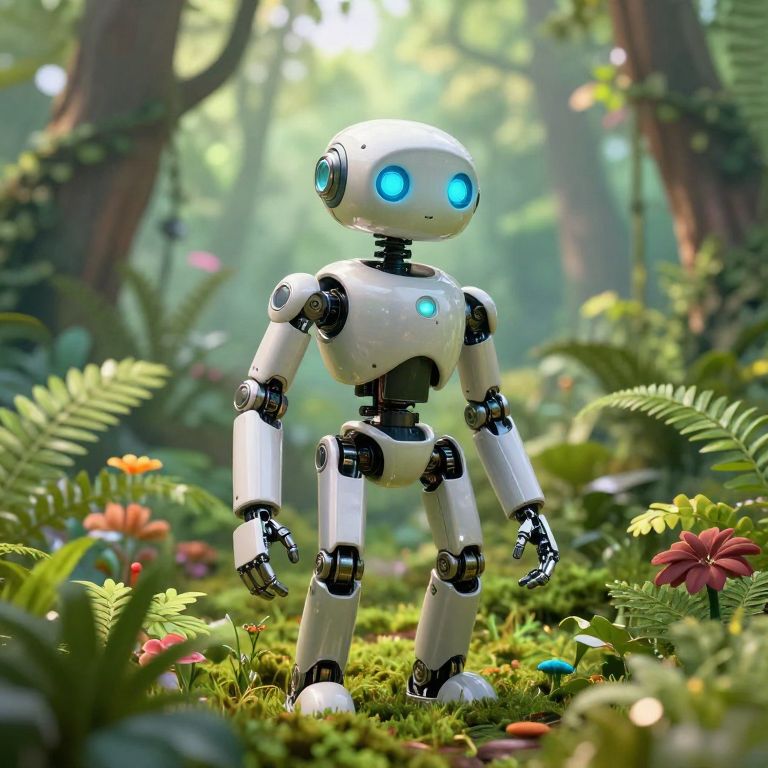 Digital art of a robotic ballerina in a white tutu dancing in a vibrant, lush forest pond with a cascading waterfall.