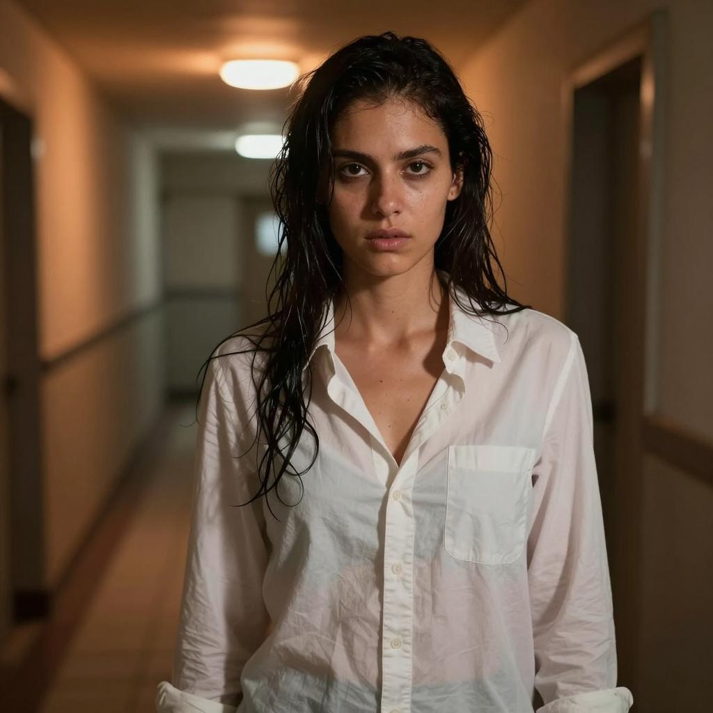 Woman with wet, shoulder-length dark hair stands in dimly lit hallway. She wears a loose, white, button-up shirt with sleeves rolled to elbows. Her expression is intense, with slightly parted lips and focused eyes. Hallway has tiled floor, warm wall lights, and wooden doors on both sides. Shadows cast on walls. Background fades into darkness.