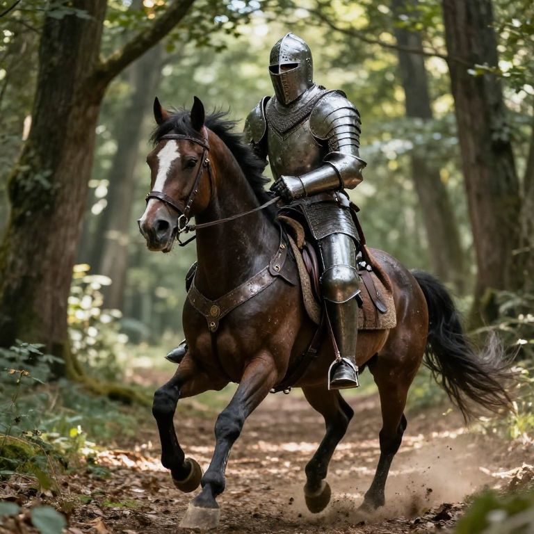 Realistic medieval knight on horseback charging through a forest path, intricate armor with weathered metal and battle scars, horse adorned with protective barding, dynamic pose with sunlight filtering through dense trees, intense expression on knight's face